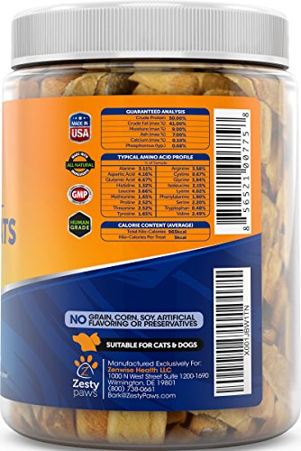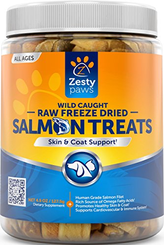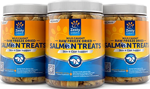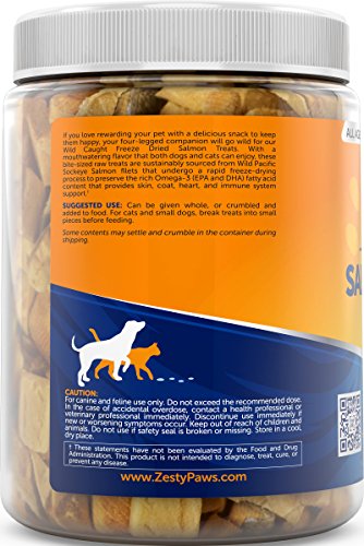 -. Feature : PREMIUM HUMAN GRADE SALMON CHEWS - Zesty Paws Freeze Dried Salmon Treats are delicious human food grade chews sourced from wild caught sockeye salmon. These snacks undergo a rapid freeze drying process to help preserve the Omega-3 content from the fish oil to ensure the best nourishment for any dog and cat of all breeds, ages and sizes. / RICH SOURCE OF OMEGA-3 FATTY ACIDS - These tasty grain free snacks are loaded with EPA and DHA to help pets stay in great shape. Omegas have been shown to provide hip and joint support for your pet, while also supporting the heart and immune system. Your canine and feline companions will love the mouthwatering flavor from each bite, and you'll love the benefits to their health. / PROVIDES SKIN & COAT CARE SUPPORT - As your pet chows down on their salmon chewable treat with you, their skin and coats will be nourished from the natural fatty acids in each piece. It's a great snack to give pets with itchy or flaky skin, so don't be surP.R.Ised if their skin starts to feel more supple and dandruff free while their coat appears softer and shinier with less shedding troubles. / SUPPORTS JOINT & IMMUNE SYSTEM HEALTH - When dogs and cats become full-grown senior pets, discomfort may occur in the hips and joints over time, which can lead to problems such as reduced movement and even arthritis pain. The omegas in these carefully crafted all-natural Freeze-Dried Salmon Treats have been shown to help promote joint pain relief and restore flexibility, while also bolstering their immune function to keep them feeling healthy and happy. / A PET SUPPLEMENT YOU CAN TRUST - At Zesty Paws, we understand how much your pet's health and wellness means to you, so we manufacture our products and pet supplies in FDA-registered facilities that are NSF and GMP-certified in the USA for quality purposes.