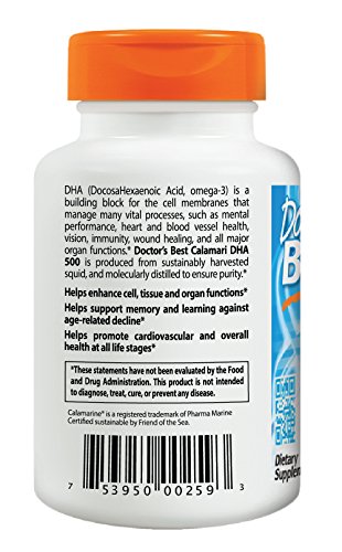 DHA (DocosaHexaenoic Acid, omega-3) is a building block for the cell membranes that manage life processes. This vitamin-like nutrient and others metabolically derived from it are vital to mental performance, heart and blood vessel health, vision, immunity and wound healing, and all the organ functions. Best DHA 500 from Calamari is produced from sustainably harvested squid, and double molecularly distilled to ensure purity.