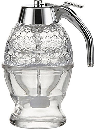 Amazon.com Review A sophisticated alternative to those pudgy plastic honey bears, this honey dispenser releases a thin drizzle of honey into your tea or steamed milk or on top of toast, hot cereal, pancakes or cornbread. The dispenser is made of glass, not plastic, with an attractive honeycomb relief. The ensemble comes in three parts: a stainless-steel lid, a glass honey container, and a glass stand. When you press the spring trigger, which is attached to the lid, honey flows from the glass nipple at the bottom of the dispenser. Release the trigger and an inner stopper mechanism closes to prevent drips. Keep the inside of the stand honey-free, and avoid overfilling the container. To prevent honey from forming a crust at the bottom, limiting the flow, rinse the glass nipple after use. To liquefy congealed honey, run warm water over the glass. This simple item will quickly become indispensable at your breakfast table. --Carol Gnojewski 0