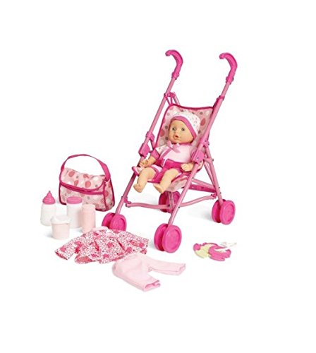-. Feature : Bundle of baby doll in all pink, a stroller, a diaper bag, a bottle, additional clothes and other baby accessories. / The stroller folds umbrella-style for easy transport and storage. / This set makes a wonderful gift for the holidays, birthdays, and any special occasion.