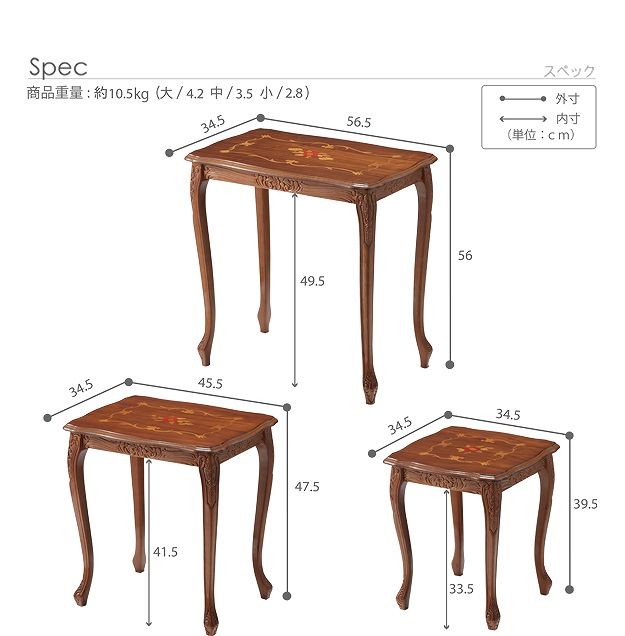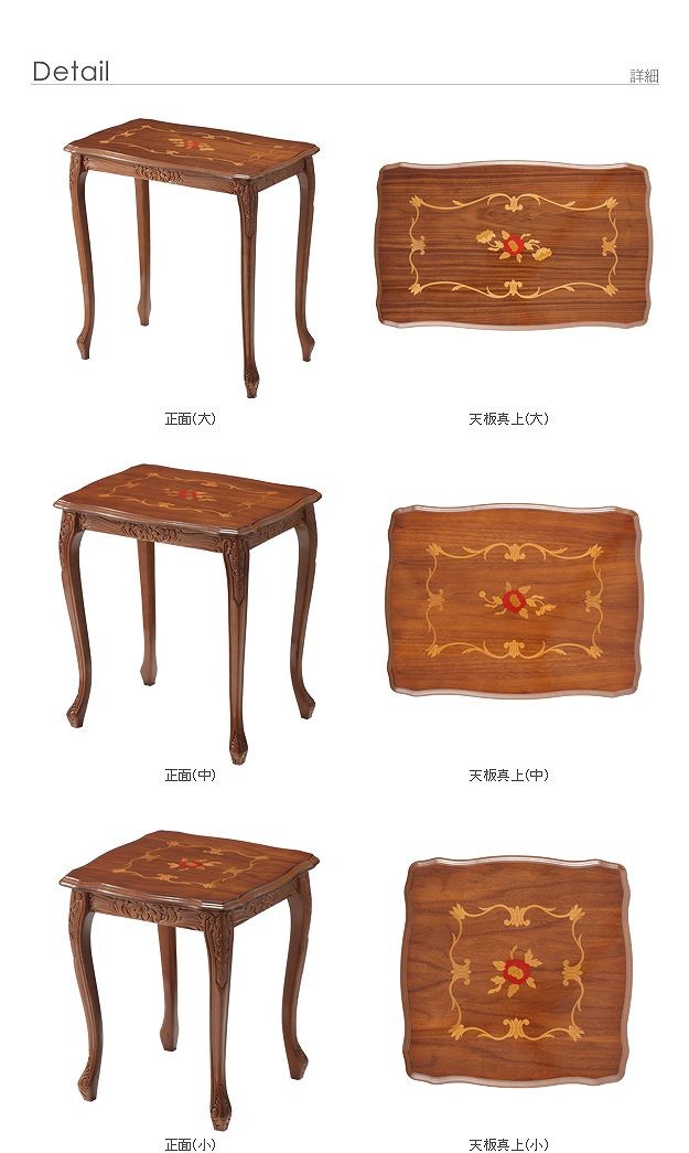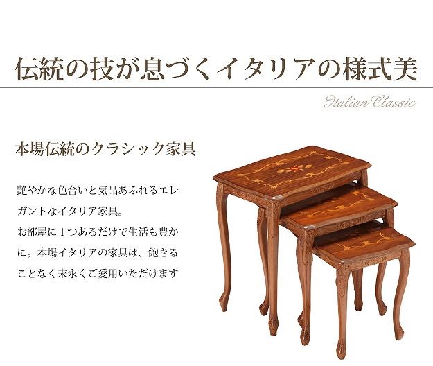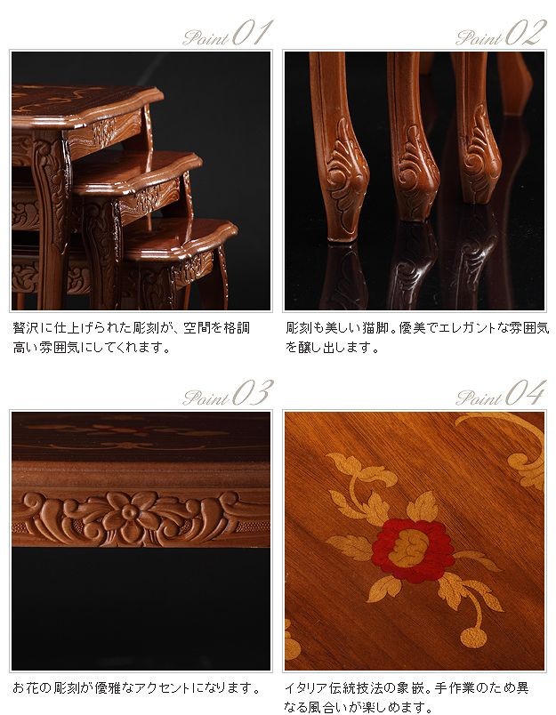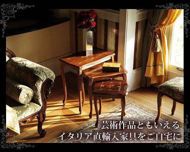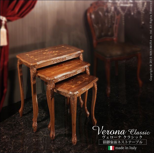 商品について:芸術作品ともいえるイタリア直輸入家具をご自宅に☆ヴェローナクラシック象嵌ネストテーブル(大中小の3台1組)。天板にはイタリア伝統の職人技である象嵌細工が施されています。彫刻と美しい猫脚が魅力。滑らかな曲線を描くフォルムがお部屋をエレガントに演出します。