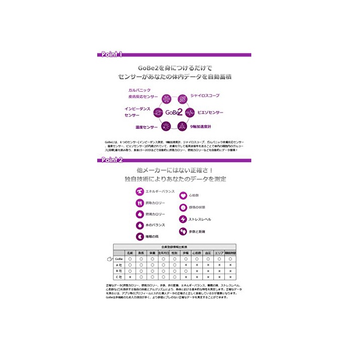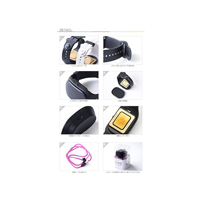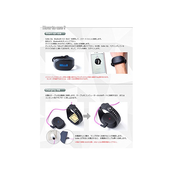 【소재】[디바이스 벨트 부분] ABS+PC수지,TPSIV실리콘,알루미늄 [충전 장치] 플라스틱 【전지】[배터리 내용]:LiPo [배터리 용량]:350mAh [연속 동작 시간]:오프로 한 상태에서2개월까지, 사용을 개시하고 나서 최대48시간 [충전 시간]:1시간반~2시간 [충전 장치 Connector]:USB