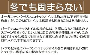 バージンココナッツオイルの場合には、冬場になると固まるのでスプーン等ですくい易いように広口の容器を使用しますが、このMCTオイルは低温でも固まらず液状なので冬場でも狭い口の容器に入れたまま使用できます。