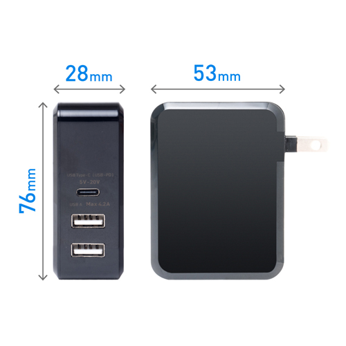 ●サイズ:約W28×H53×D76mm(プラグ収納時) 重量:約130g 材質:ABS 入力:AC100V~240V 出力電圧:1.USB Type-C端子:5v3A / 9v3A / 15v3A / 20v2.25A