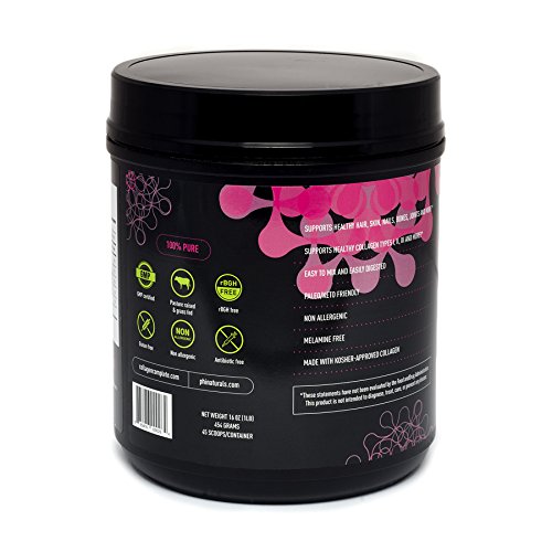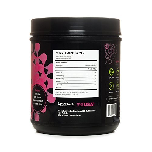 Collagen peptides by Phi Naturals are from healthy grass-fed bovine. Collagen is the building block of healthy skin, joints, hair and nails. Collagen forms the elastic netting that supports youthful, vibrant-looking skin. As you age, your body's collagen deteriorates from use and exposure to free radicals and natural degradation. Proper collagen supplementation rebuilds the body's collagen and helps maintain all of the body's structure. List of Amino acids in collagen; GlycineProlineAlanine Hydroxyproline Glutamic acidArginineAspartic acidSerineLysine LeucineValineThreoninePhenylalanineIsoleucine HydroxylysineMethionineHistidineTyrosineCysteine No TryptophanFeature