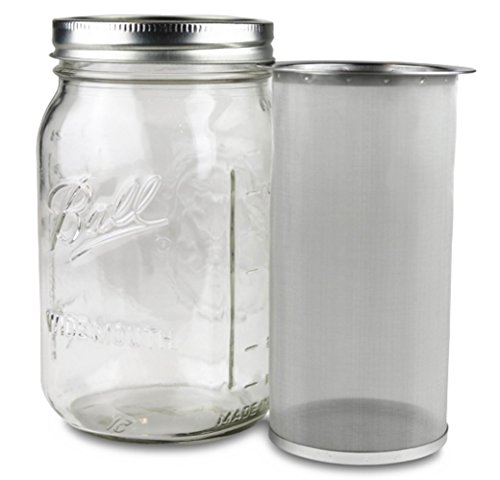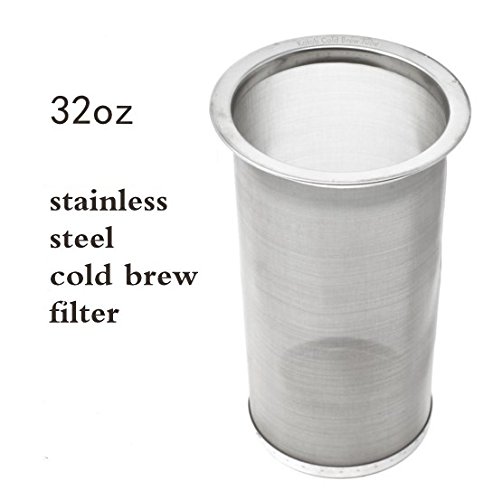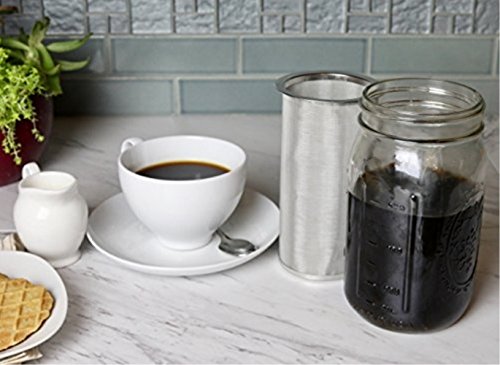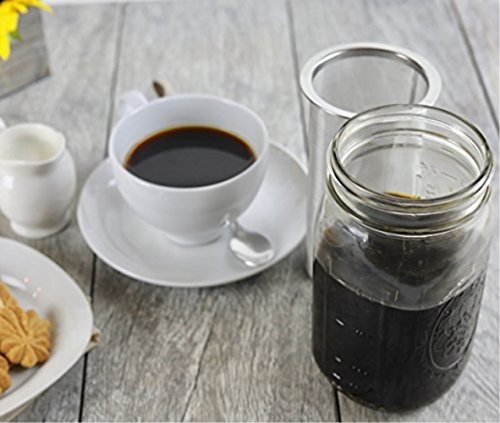 Product Description *Fits 32 oz Wide Mouth Mason Jar.Fine mesh filter with a 32 oz (1 quart or 945 ml) wide mouth mason jar, like the affordable Ball Mason Jar, to make cold brew coffee, tea or fruit infused water. *Easy to Clean Dishwasher Safe.Make your own cold brew coffee easily without the mess using our stainless steel mesh filter. Clean up is quick and the coffee maker filter is dishwasher safe, top rack only. *Large Durable Filter: The extra large, heavy duty stainless steel filter allows a 1:3 coffee to water ratio that results in a strong coffee concentrate and less acidity. The fine mesh filter prevents grounds from entering the coffee. *Brew Coffee, Tea Infuse Water: Make a batch of delicious cold brew coffee. Add coffee grounds, let steep overnight and have cold brew coffee ready in the morning! This multifunctional stainless steel filter can also brew cold or hot tea or infuse water with your favorite fruits! *Easy to use: Simply pour coarse ground coffee into the filter basket, add water and allow to steep for 24 to 48 hours. Remove the filter basket and discard the grounds and you have about 1 quart of delicious coffee concentrate. All components are dishwasher safe.
