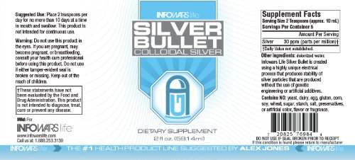 -. Binding : Health and Beauty -. Brand : Infowars Life -. EAN : 0720825769844 -. IsAdultProduct : 0 -. Label : Infowars Life -. LegalDisclaimer : Check with your doctor before taking. -. Manufacturer : Infowars Life -. PackageQuantity : 1 -. ProductGroup : Health and Beauty -. ProductTypeName : HEALTH_PERSONAL_CARE -. Publisher : Infowars Life -. Studio : Infowars Life -. Title : Silver Bullet - Colloidal Silver - 2 fl. oz. -. UPC : 720825769844