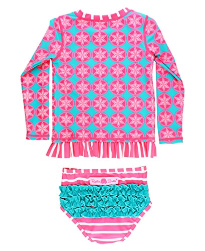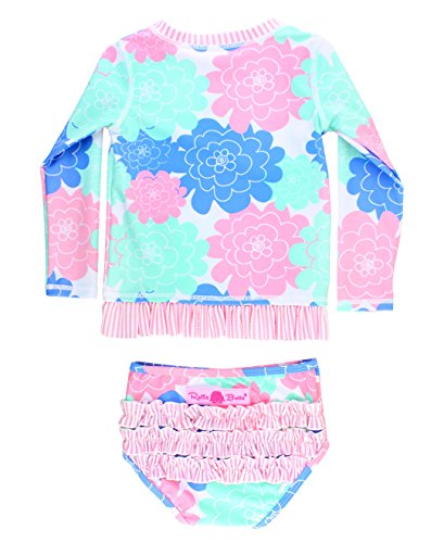 Our newest version of your favorite rash guard bikini has long sleeves and built-in UPF 50+ sun protection! Pair with 100% UVA/UVB protected sunglasses for a sunshine ready look! All RuffleButts swimsuits are made of a high quality nylon and spandex blend to be durable against sun, sand and chlorine. The soft and stretchy fabric means there is no need for a button or zipper to easily pull on and off. Bikini bottoms are fully lined and designed to fit over a diaper without bulky or sagging fabric. The bikini bottoms feature a full elastic waist and leg openings for a fit that will comfortably stay in place for active little girls. Rear ruffles are featured on all sizes of RuffleButts swimwear.Feature