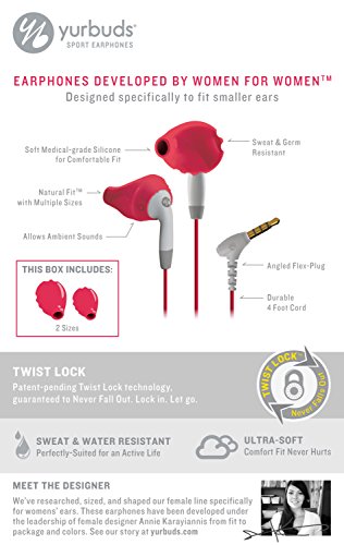 -. Binding : Electronics -. Brand : Yurbuds (CE) -. Feature : TwistlockTM Technology: Yurbuds TwistLock into place for a secure fit that never falls out, even under the most intense workout conditions. / Sweat + Water Resistance: Developed for training in any conditions. IPX 5 Rating available on Venture Pro, Explore Pro, Venture Talk, Explore Talk, and Venture Duro. / Ambient Noise Awareness: Designed to allow more ambient noise than most other earphones at the same volume levels. / Exceptional Sound Quality: Clinically proven acoustics for deeper, richer sound. / Flexsoft: Ergonomically designed to avoid nerve rich areas of the ear. Made with flexible silicone, Yurbuds are ultra soft and comfortable for hours on end. -. Label : Yurbuds (CE) -. Manufacturer : Yurbuds (CE) -. MPN : Yurbuds-Inspire -. PackageQuantity : 1 -. PartNumber : Yurbuds-Inspire -. ProductGroup : Speakers -. ProductTypeName : HEADPHONES -. Publisher : Yurbuds (CE) -. Studio : Yurbuds (CE) -. Title : Yurbuds (CE) Inspire Female Earphones