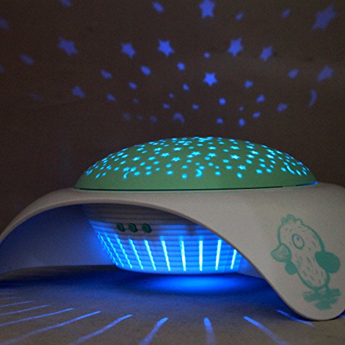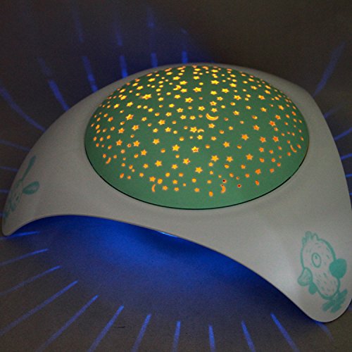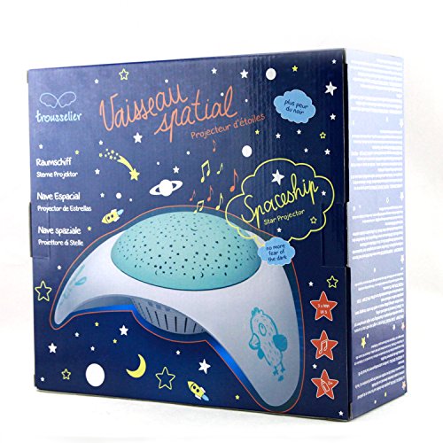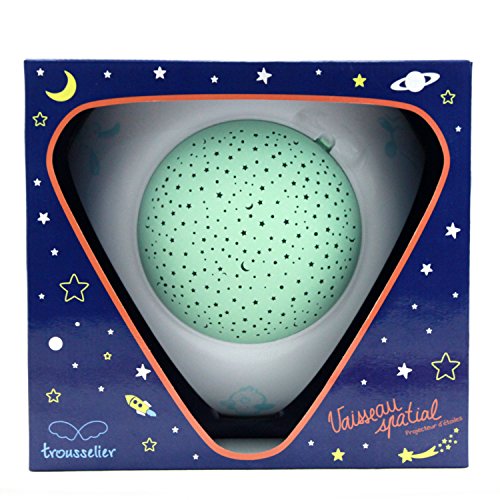 Studio : Trousselier Publisher : Trousselier Binding : Baby Product Product Description SPACESHIP - STAR PROJECTOR can project a night sky with stars in a room. It glows warmly and projects a fascinating starry night atmosphere up to 10 feet (3 meters) to walls and ceiling. Select either 15 minutes of 4 different melodies or watch the color changing starry projection with or without music. An internal timer will automatically turn off the SPACESHIP - STAR PROJECTOR after 30 minutes. 0