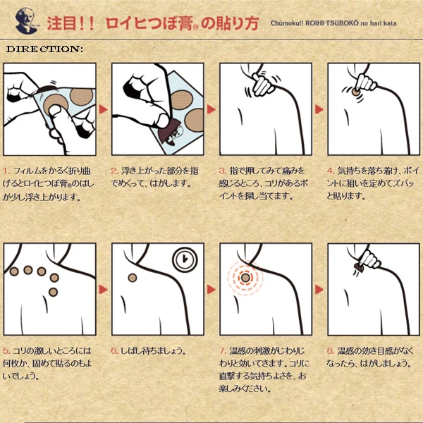 Please peel away the film which is attached to the plaster side of the ROIHI TSUBOKO and attach the tape directly onto the painful area.