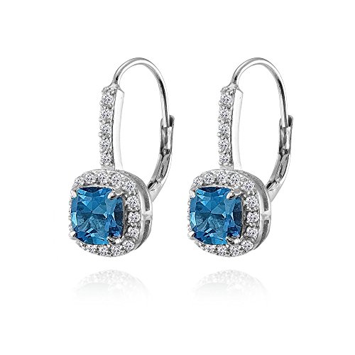 These fantastic dangle earrings are made with cushion-cut london blue topaz gemstones and surrounded by round-cut white topaz gemstones. These beautiful earrings are secured with leverbacks and are crafted of fine sterling silver.