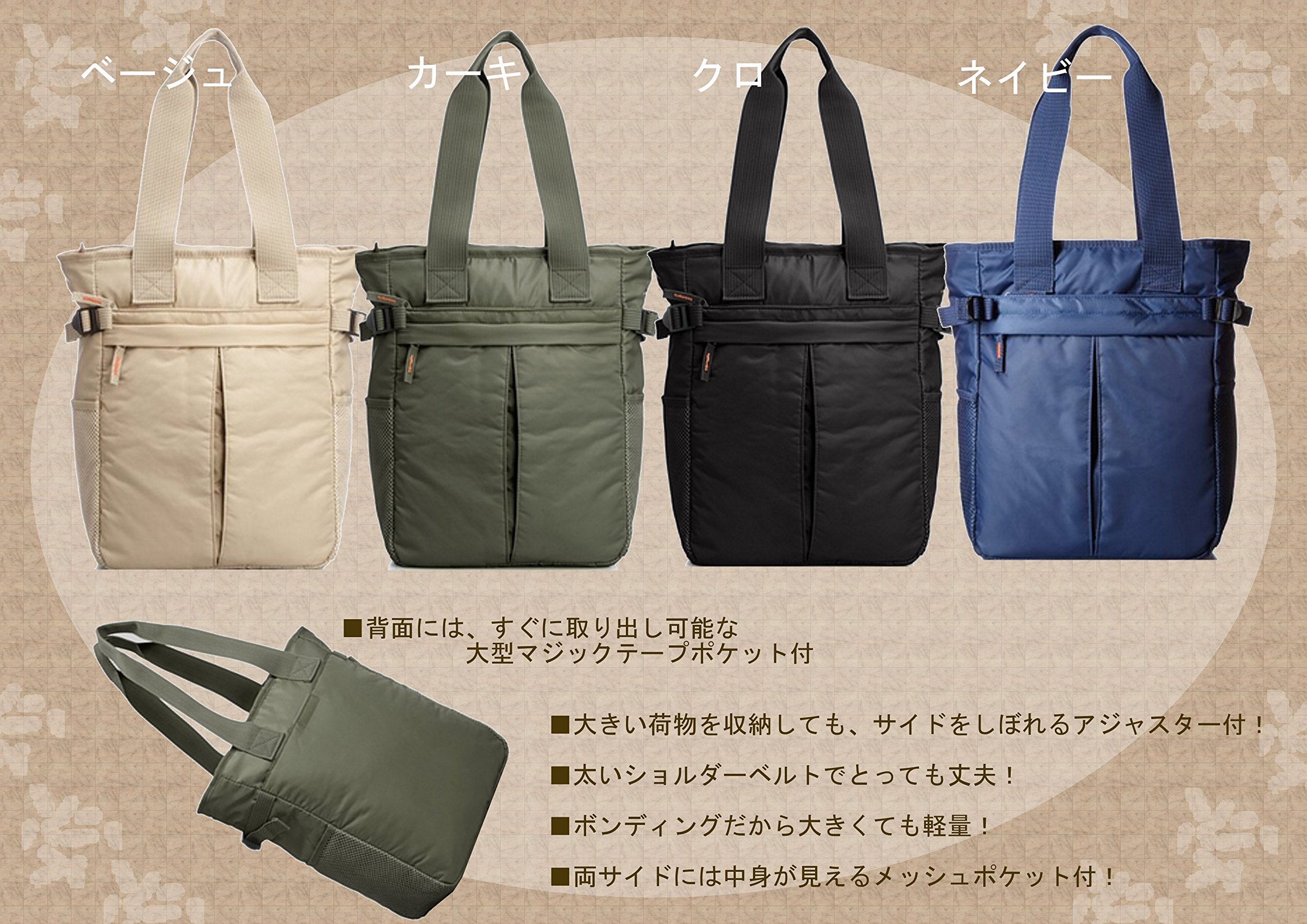 It is lightweight and durable bonding fabric, it is a vertical type tote bag that is compatible with B4 size.