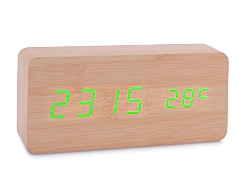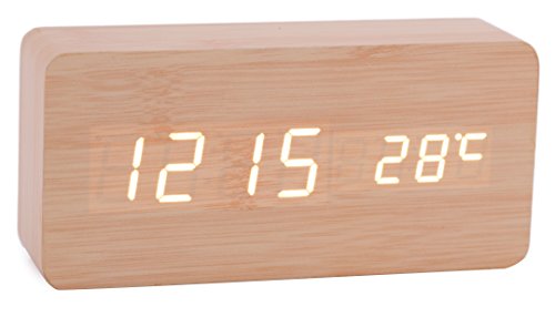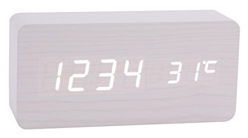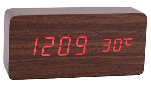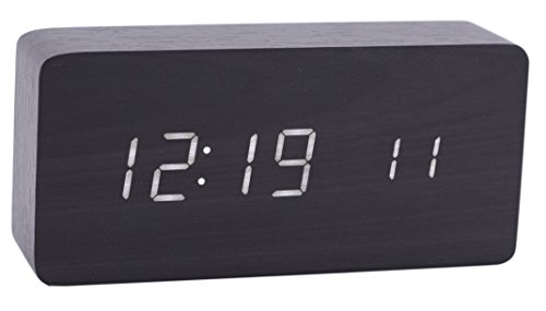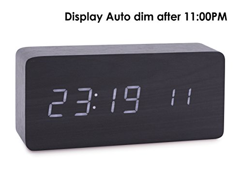Konigswerk Wood Grain LED Alarm Clock - Time Temperature Date - Display Sound Activated - Auto Brightness Adjustment (Black-White) AC020G