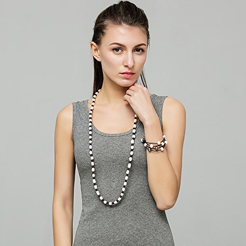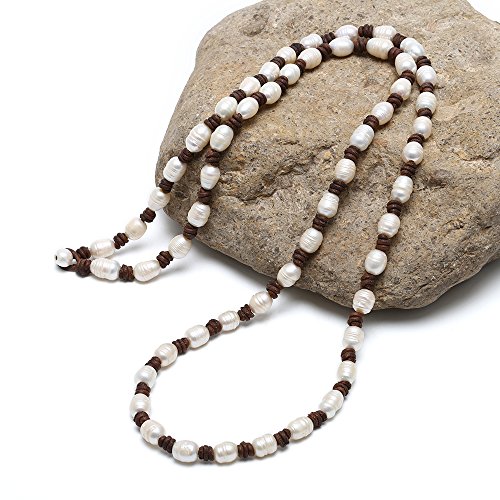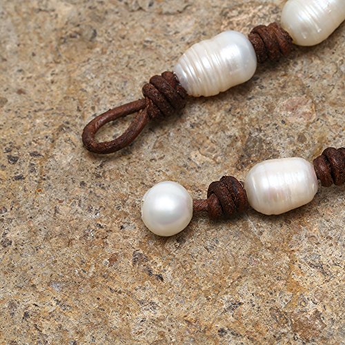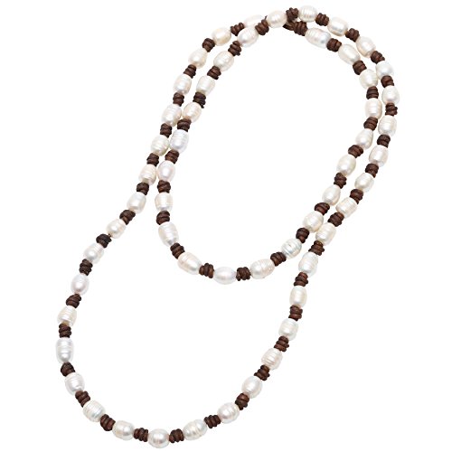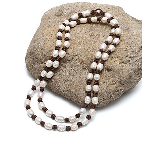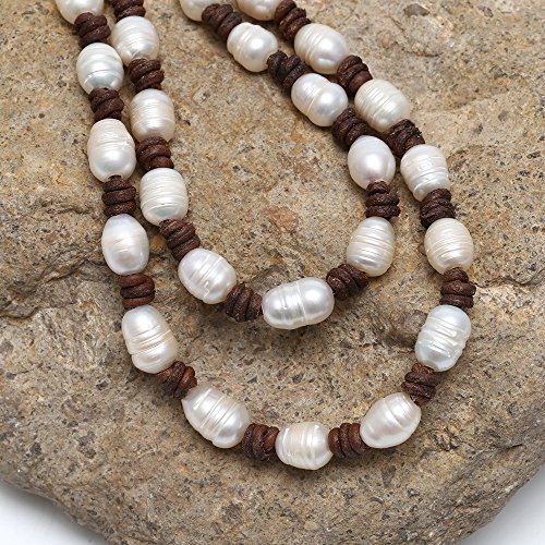 Style: Cultured Freshwater Pearl Beaded Strand Necklace Handmade Genuine Brown Leather Long Necklace Costume Jewelry 39''