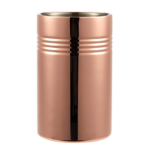 Studio : Juvale Publisher : Juvale Product Description Keep your wine or champagne at the perfect chilled temperature with this stainless steel copper plated wine chiller. Simply add ice and rest your wine bottle inside. No need to worry about condensation on your table or warm wine. Not just functional, it's also a sight to behold. The gorgeous rose gold copper plating and durable stainless steel construction makes this a gift worthy of giving whether for wedding or birthdays. 0