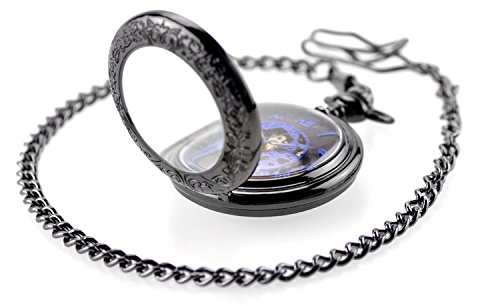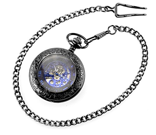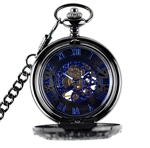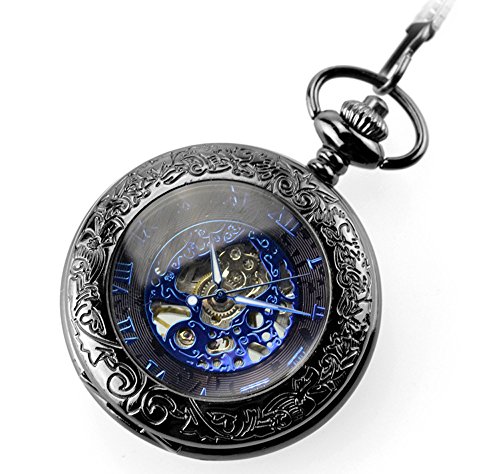 BesTn Mechanical BesTn출품 회중 시계 손으로 맒 스켈리턴 남녀 앤틱 찬 부착 약간 크 로마숫자 스팀 펑크 블랙 블루