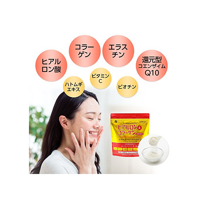 성분/어콜라겐 펩티드,연유 파우더,비둘기《무기에키스》,엘라스틴 펩티드,코엔자임Q10(환원형)고, 덱스트린,트레이닝 헬로《스》,히알론산,V.C,향료,감미료(《스쿠라로스》)고, 《비오친》(원재료의 일부에 젖,대두를 포함한다)