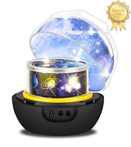 1. Diamond Surface. 2. Removable the cover, dual use as a projector or a colorful night light. 3. 360 Degree Rotation long press button B, provides an amazing moving sky. 4. 3 Brightness Dimmable,100%, 50%, 5%. 5. 6 Changeable Projection Films- Solar System Universe, Starry Star New Moon, Twinkling Star Full Moon, Aquarium, Christmas and Happy Birthday. 6. Powered by 3 pieces AA batteries(Not Included) or 5V Power on USB port. 7. Ideal for decorating wedding, birthday, parties. Great for romantic night lamp and decoration light use!