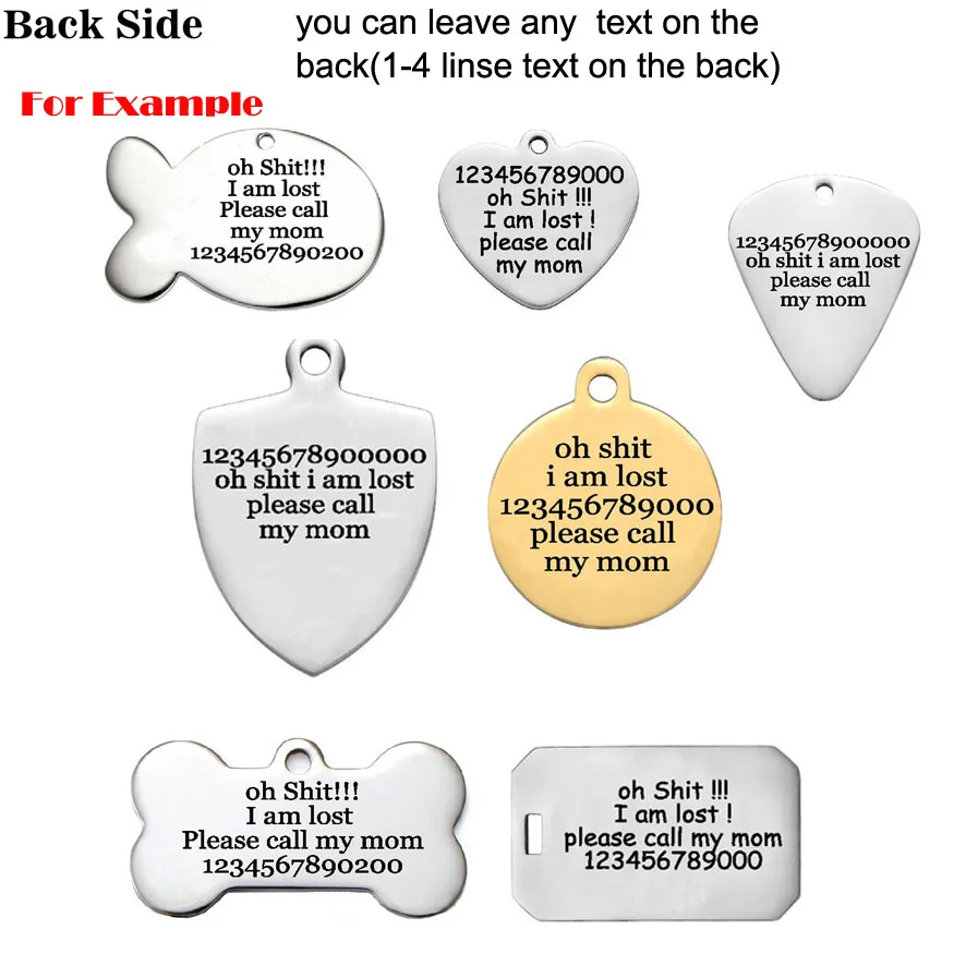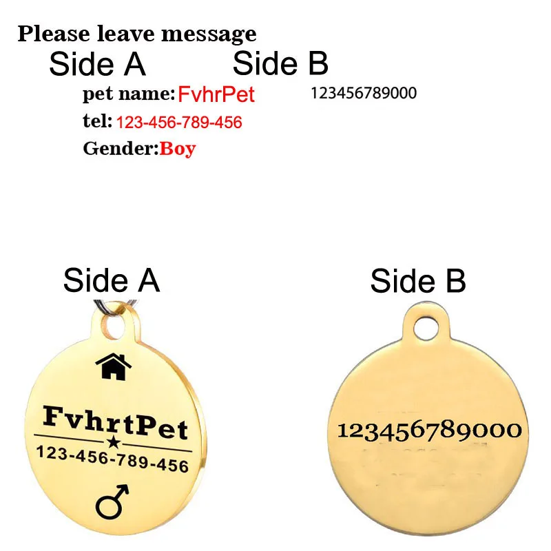 Front Side:Pet Name AND Tel Number AND Pet Gender