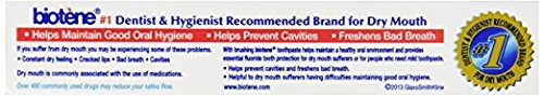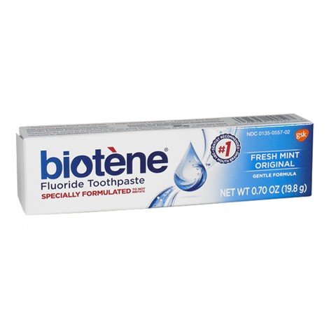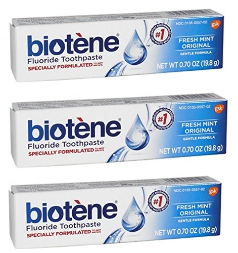 -. Brand : Biotene -. EAN : 0025093050237 -. Feature : Biotene dry mouth toothpaste and toothpaste gel are formulated to help maintain the oral environment / So if you suspect you may be one of the millions of Americans with dry mouth, brushing with biotene dry mouth toothpaste is a simple way to help maintain the health of your mouth / Biotene toothpaste helps provide essential tooth protection for dry mouth sufferers / Biotene toothpaste contains no sodium lauryl sulfate (SLS) / Biotene's low-foaming formula is gentle on dry, irritated mouths -. IsAdultProduct : 0 -. Label : Biotene -. Manufacturer : Biotene -. MPN : buitoothtrvl -. PackageQuantity : 3 -. PartNumber : buitoothtrvl -. ProductGroup : Health and Beauty -. ProductTypeName : PERSONAL_CARE_APPLIANCE -. Publisher : Biotene -. Studio : Biotene -. Title : Biotene Dry Mouth fresh Mint Toothpaste 0.70 Oz Travel Size (Pack of 3) -. UPC : 025093050237