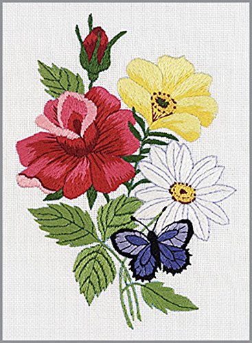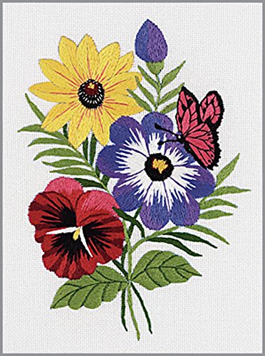 - 2 Janlynn Crewel Embroidery Kits with beautiful floral designs: Butterfly & Floral Embroidery (004-0853) and Floral Embroidery (004-0852); colorful rendering of summertime garden blooms in shades of red, yellow and purple; each floral arrangement of blossoms is accented with a colorful butterfly