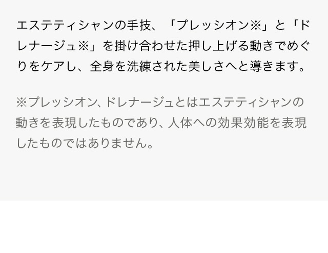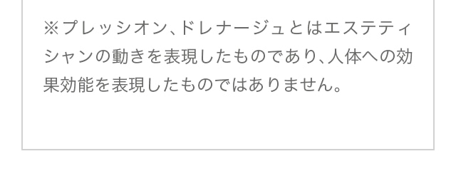 ※プレッシオン、ドレナージュとはエステティシャンの動きを表現したものであり、