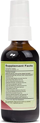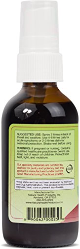 -. Feature : Multi-herbal throat spray featuring echinacae, propolis and red root designed for both symptomatic relief and general immune system support / Supports healthy immune response / Promotes lymphatic drainage and encourages healthy microbial balance / Sested Use: Spray 2 times in back of throat and swallow as directed by your healthcare practitioner. Shake well before using. / DOES NOT CONTAIN: Wheat, gluten, soy, milk, eggs, fish, crustacean shellfish, tree nuts, peanuts
