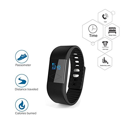 -. Feature : 5 modes HD displayed on the OLED screen:Time mode,Step tracker,Calories mode,Distance mode and Sleep monitoring mode. / Smart bracelet is applied by professional Bluetooth RF signal and own-developed algorithm,the accuracy can reach 95% and above. / Once the fitness monitor connected to smartphone,it wil record and analyze your activities and sleep status automatically. / Vibrating alert,when having a call or smartphone beyond 16 FT,never miss important calls also anti lost phone. / Keep the bracelet screen horizontal and turn over wrist,then it shows time and take picture when the APP program stars.
