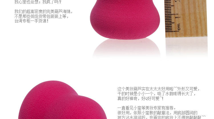 | 店主说 | 亲爱的同学们~这样具有革命性的圆形3D海绵工具最近实在是有太火~不但在美国获得了权威allur杂志的年度美妆工具大奖~就连大美人李嘉欣也在微博里也连连称赞~那么跟风是必须的~我火急火燎从美国收了个回来~ 这款超级大热门的葫芦海绵上妆无须置疑的了!专柜卖到100多,价格实在吓人~ 基本都是出口的,佳佳在国内出口厂家一手货源进货,质优价廉~非常划算哦~人手一块的必备款化妆工具,你还等什么!! | |