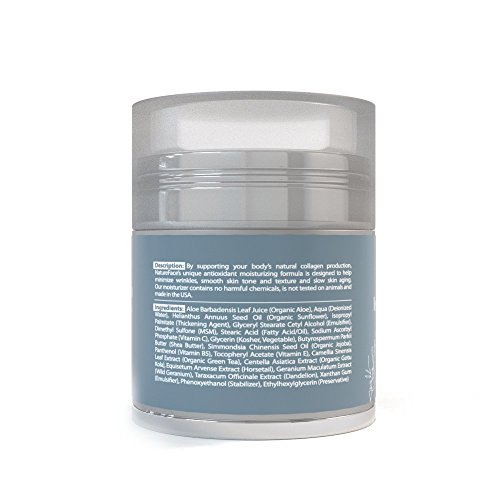 - ORGANIC INGREDIENTS – Our organic face cream is developed with dermatologists and formulated with organic ingredients, including Green Tea, Aloe Vera, Methylsulfonylmethane (MSM), Vitamin B5, Vitamin C, Vitamin E, Jojoba, Shea Butter, Sunflower Oil, Horsetail, Wild Geranium, Dandelion and Gota Kola. These ingredients combine to soothe, moisturize and protect your skin. This advanced blend of vitamins, nutrients and antioxidants protects, nourishes, moisturizes and beautifies your skin.