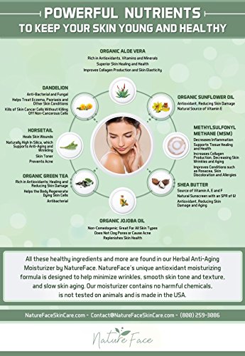 - SATISFACTION GUARANTEED – Our face moisturizer is developed and produced in the United States. NatureFace offers the best skincare products, using the highest quality wild-sourced natural ingredients. Our face cream products are developed by a team of nutritionists, dermatologists and skin care experts and backed by a FULL MONEY BACK GUARANTEE! We want the best for your health, beauty and happiness and want you to enjoy the anti-aging results and long-lived beauty you deserve.