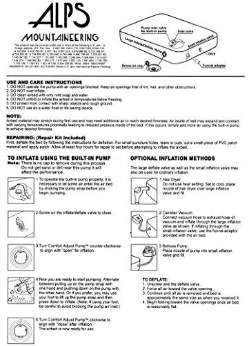 ReleaseDate : 2012-03-15 Studio : ALPS Publisher : ALPS Binding : Sports Product Description Tired of sleeping on the hard ground when you go camping? Invest in an ALPS air bed and treat yourself to a good night’s sleep. ALPS air beds also work great as a “spare bed” when you have relatives staying with you for the weekend. ALPS air beds feature special, top-of-the line fabric and coil construction to provide the best durability and comfort, making them perfect for indoor or outdoor use. The reinforced bed construction provides a comfortable, uniform sleeping surface and the outer ring provides a stable edge support. Our beds are constructed of industry leading, extra thick and durable PVC materials helping to make them puncture resistant, along with welded seams for extra durability. The air bed bottom and side fabric is 17% thicker than the leading competition and the top is 10% thicker … that’s impressive! Our plush, velvety soft flocked top provides a luxurious sleep surface and prevents bedding from slipping or sliding around. Plus, all beds are 100% factory inspected and come with a one-year guarantee. 0