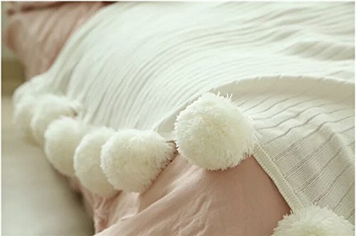 DOKOT Cotton Knitted Throw Blanket, Sofa/Bedding/Couch Cover with Pom Poms (59" x 79", White)