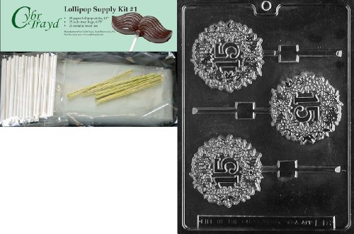 Cybrtrayd 15th Lolly Letters and Numbers Chocolate Candy Mold with Lollipop Supply Bundle of 25 Gold Twist Ties