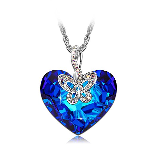 -. Title : J.NINA "Butterfly Love" Made with Bermuda Blue Swarovski Crystal Heart Design Women Jewelry Pendant Necklace