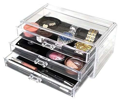 - Feature : Clear acrylic matches any decor / Removable black mesh padding keeps jewelry protected and in place. / Completely removable drawers, Organizes all jewelry and cosmetics in one place. / Approximate Dimensions: 9 3/8" x 5 3/8" x 4 3/8"H, Accessories not Included / Brand: Sodynee