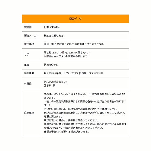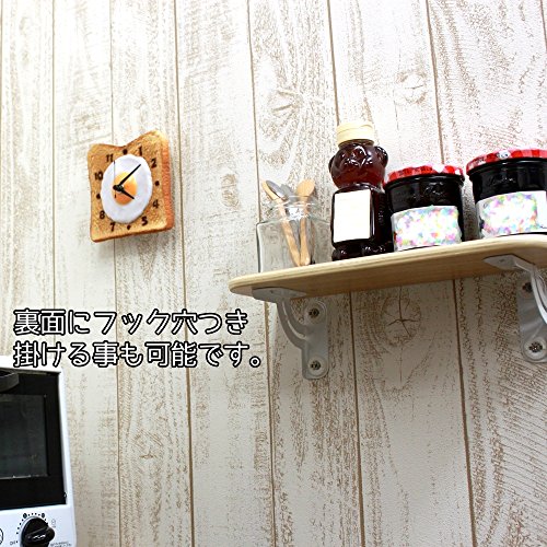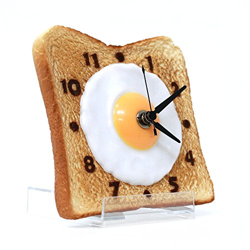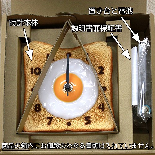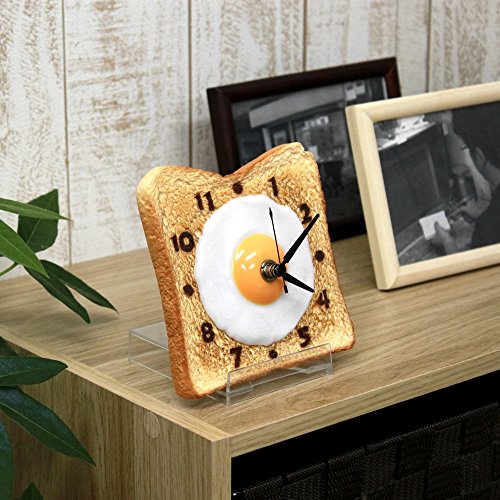 -. Feature : 美味しそうな目玉焼きトーストの食品サンプルが文字盤。美味しそうで、思わずかじりたくなる「たべもの時計」です。 / 【寸法】高さ約11.8cm×幅約11.8cm×厚さ約4cm ※厚さはムーブメント背面から秒針まで。本物の食パンと同じサイズです。 / 【重量】約260グラム ※本物のトーストよりも堅くてずっしりと重さを感じます。食べ物ではありません。 / 【製造国】日本(東京都)【製造メーカー】株式会社おりある【使用素材】トースト本体:塩ビ、時計針:アルミ、時計本体:プラスチック等 / 【時計ムーブメント】月差30秒(条件:1.5V・25℃)日本製(長野県、おりある刻印入り)、ステップ秒針、単三電池1本使用【付属品】置き台1個