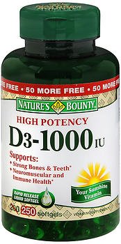 Studio : Nature's Bounty Publisher : Nature's Bounty Binding : Health and Beauty Product Description Lack of exposure to sunlight may reduce Vitamin D levels in the body, especially during winter or in northern climates. Additionally, skin-protecting sunscreen can reduce your body's ability to meet its daily Vitamin D needs, even during summer. Food is another source of Vitamin D. However, among US adults who obtained Vitamin D from food alone, about 95% had insufficient Vitamin D intake. Nature's Bounty Vitamin D3 is a smart way to ensure your body gets enough Vitamin D. Potent Form of Vitamin D, Aids in Neuromuscular Health. Vitamin D3 is a potent and active form of Vitamin D. Vitamin D helps your body absorb Calcium to help support bone density and healthy teeth.* These softgels provide a high-potency source of Vitamin D3 to help maintain neuromuscular health-the combination of the nervous system and the muscles working together.* 0