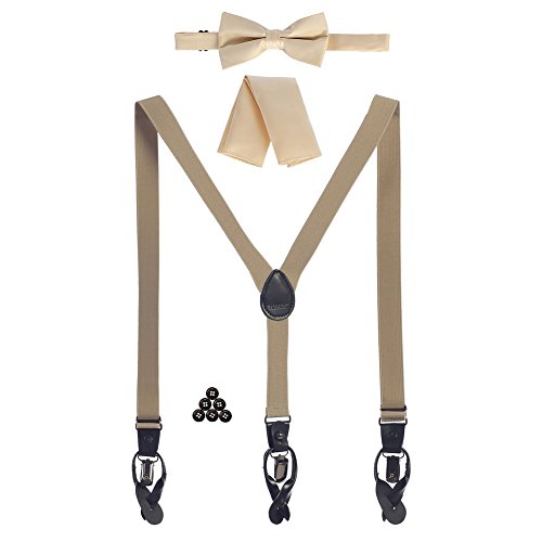 Studio : B-One Publisher : B-One Binding : Apparel Product Description Convertible suspenders, bow tie, and hanky set from Gioberti give an ultra-elegant look to your stylish boy! Y-back style suspenders with genuine leather crosspatch, leather button tabs with elastic. They are 1 inch wide, 43 inches long. Set includes 6 buttons, and silver metal finish adjusters, matching satin bow tie and handkerchief. It comes in an impressive gift box packaging. 0