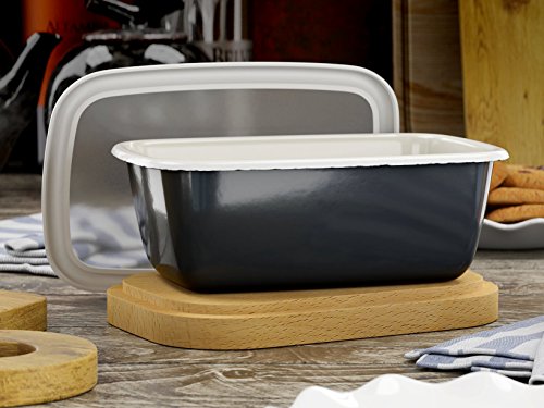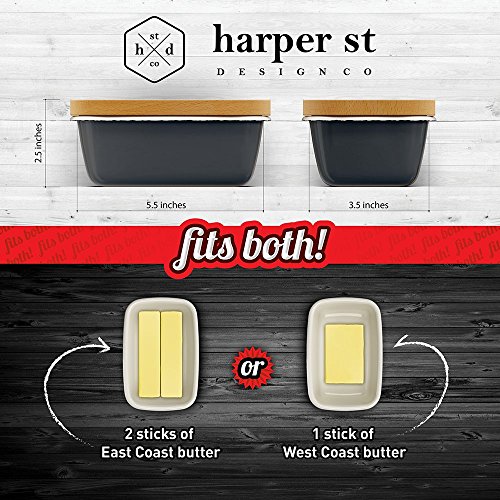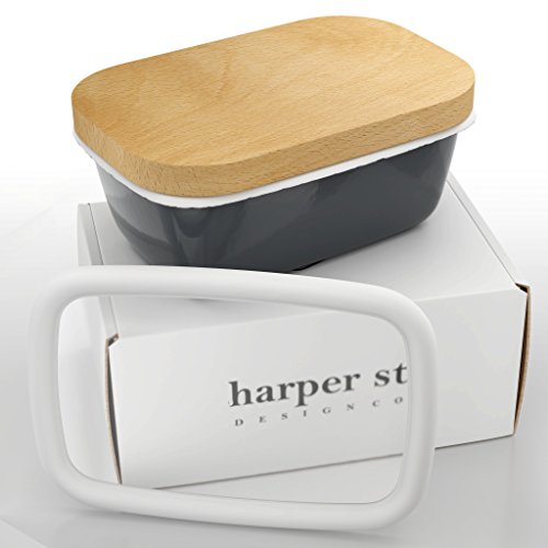 Studio : Harper St Design Co Publisher : Harper St Design Co Product Description Inspired with Your Ease in Mind It seems silly to call a butter dish "easy to use" but because it functions as so many things, our unique butter stick holder makes it so you don't need to get out so many kitchen utensils. That means less clutter while cooking and less dishes to clean. Unmatched Versatility While most butter dishes are just that, ours allows you to use it for other items and utilization. Because our dish is made from heat resistant materials, you can convert it into a pan for baking small servings of food like bread or casseroles. After cooking, use the wood top as a platter to impress guests. Seals and Protects Food As it also comes with a durable plastic, our well thought out design ensures freshness and longevity whether it's left in the refrigerator or on the counter. Impress Your Guests We challenge anyone not to be awed at the fun and versatile uses of our butter dish. A great talking point, any guest would be wowed by the functionality and craftsmanship of our products. Product Color Variations Our classic butter dish with beechwood top comes in 2 great colors combinations for you to choose from: Stone gray with a white rim Pure white inside and out Product Sizing 6 inches long 4 inches wide 2 ½ inches deep Stores up to ½ lb or 2 sticks. Fit almost all brands including Land O Lakes, Anchor, Kerrygold, Organic Valley, Breakstone's, Plugra, Tillamook, Cabot, Crystal Farms, Darigold, Keller's and many others. Product Materials The interior is made of durable carbon steel, a vitreous enamel coating, and a beech wood lid. 0