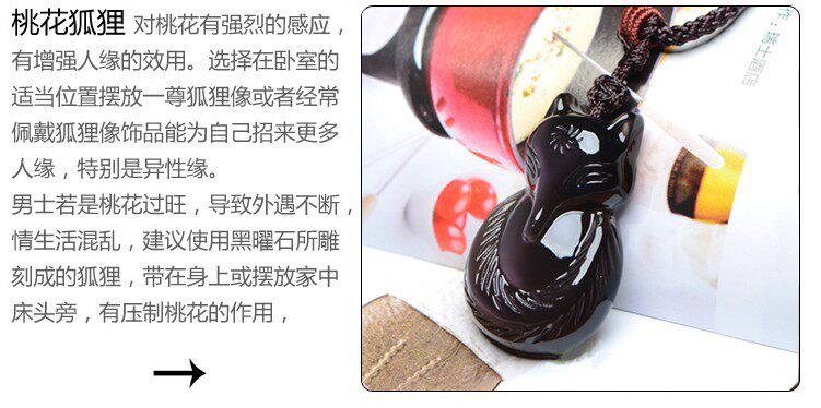 ? ? ?In feng shui, the fox as a strong sense of peach, with enhanced popularity of utility. Select the appropriate location in the bedroom, placed a statue of a fox like a fox or often worn as jewelry can provoke more karma for themselves, especially Yixing Yuan. Fox as usual pink and black is better: pink with Bo, Yixing Yuan is not a good person best able to obtain a powder to enhance self-fox charm; black to professionals, Yixing Yuan who is too busy to choose this for themselves block rotten peach, and seek true love. If peach excessive, leading to an affair continued, chaotic love life, we recommend using the carved obsidian fox, carry around or placed beside the bed at home, have a role to suppress peach, peach go on energy and resolve black fox off. Obsidian fox with her ??husband, said to avoid repetition romantic encounters it! You do not prevent a try! Peach sounds good though, but for a friend who has loved one, this is not good news. The obsidian fox gift he (she) can resolve this unnecessary trouble, let your feelings forever. Let obsidian fox guard your beautiful love! ! If you find your other half outside the peach, then it can be allowed to wear the black fox, that is, this "affair fate" all transferred to the "fox" to take this resolved, the parties can be a lot of fresh, have more energy and time on the cause! If you can not wear, can be placed inside the pocket, the car, the next bag, pillow, mattress.