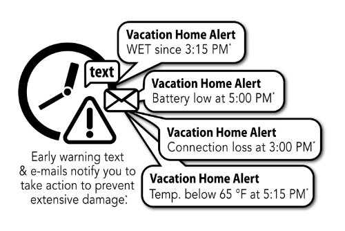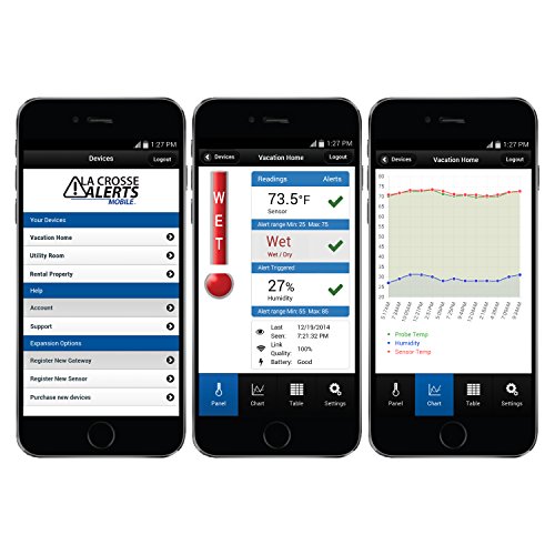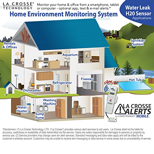 Receive water leak alerts and remotely monitor the temperature/humidity levels of any environment with the La Crosse Alerts Temperature & Humidity Monitor & Alert Kit with Water Probe. This monitoring kit includes a small sensor probe that detects water, allowing you to monitor for leaks. The kit also includes a main sensor for use as a separate temperature/humidity monitor. Use your smartphone, tablet, or PC to remotely view data and receive automatic alerts from both sensors! The main sensor's built-in screen displays its ambient temperature and humidity readings, as well as the probe's WET/DRY readings. How It Works: The Internet Gateway connects to your Internet router via Ethernet. The battery-powered temperature sensor can be placed up to 200 feet away from the Gateway. The attached water probe can be placed up to 6 feet away from the sensor. The sensor and probe take readings every 6 seconds and send them wirelessly to the Gateway, allowing you to view data through your online account at lacrossealerts.com. Login through any browser to see current temperature and humidity levels. Monitor Min/Max Levels: The system sends automatic text or email notifications when readings exceed your min. or max. setpoints. Notifications will also be sent if the sensor loses its connection to the Gateway, or if it has low battery. The Gateway supports up to 5 different models: 1) original 2) with dry probe 3) with water probe 4) with wet probe, non-threaded 5) with wet probe, threaded.. Kit Includes: Sensor; Water Probe; Internet Gateway; Remote Monitoring and Alerts: (5) years of remote monitoring and 3 months of early warning alerts via text/e-mail ; AC Adapter; LAN Cable; Mounting Hardware; Product Overview; Activation Key Card. NOTE: Requires two AAA batteries (not included). High-speed Internet and a router also required for alerts.Feature