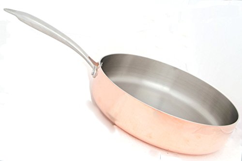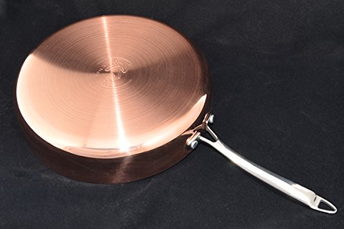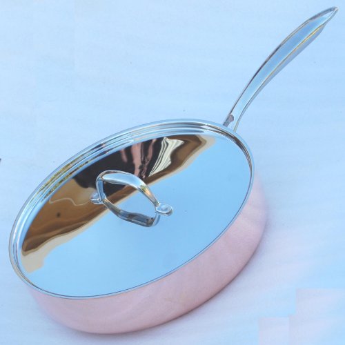 The highlight of our Saute pan is the 3.5 mm thickness. The copper exterior is 0.5 mm, the aluminum core is 2.5 mm, and the stainless steel interior is 0.5mm. Home chefs that love conduction in their pan will cherish this everyday use item. The aluminum core is a good compromise (over copper core). This pan will heat quickly on the stove but also cool fast to prevent burning. The 11-inch frying pan excels in browning meats and for sauteing vegetables. Our pan has a straight side for sauces, gravies and curry. The classic elegance of the copper bottom will tarnish into a heirloom tarnished patina that has been cherished by mankind for ages. Brighten up your life with the glow of copper. Master the art of De-glazing and caramelization and make perfect fond for delicious Sauces. The stainless steel surface interior is easy to clean and is neutral to taste. This pan requires very little oil and encourages healthy cooking. Delicious gourmet entrees promote small helpings and cut down on caloric intake. The Ergonomic riveted handle allows for robust use.Feature