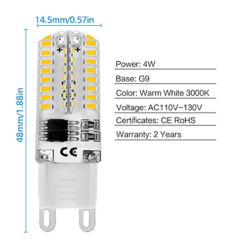 - WHAT YOU GET: Pack of 6 units 4W dimmable G9 LED bulb, comfortable warm glow 3000K. Please check if the dimension can fit your light fixture