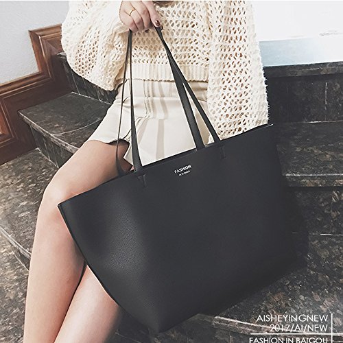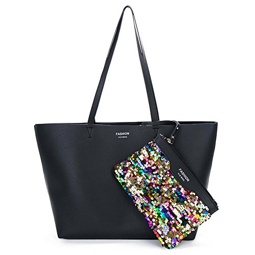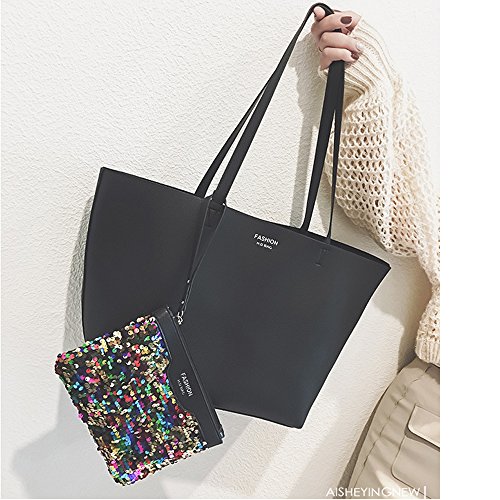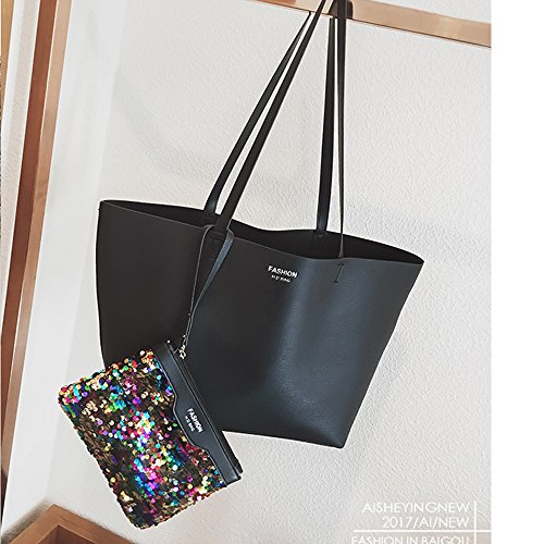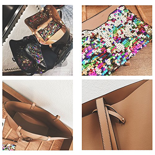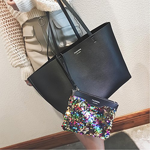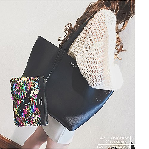 Women 2-Pcs Tote Bags Fahion PU Leather Handbag Spangly Clutch Shoulder Bag Set