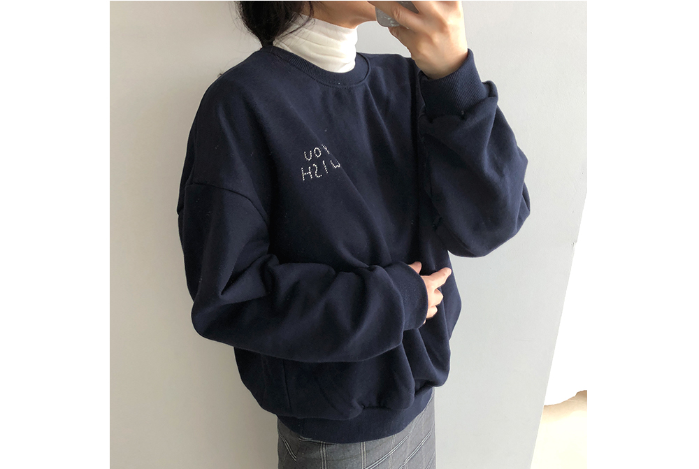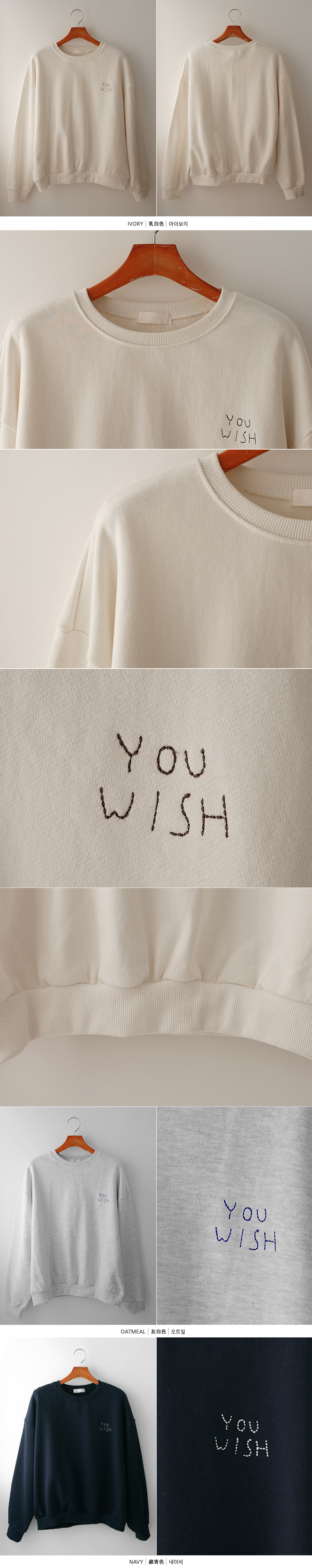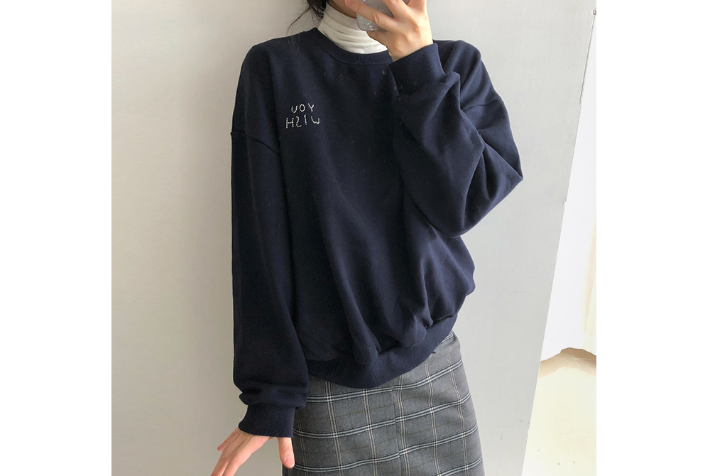 위시 자수 캐주얼 맨투맨 티셔츠
