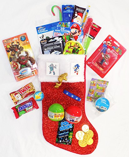 Studio : Over the Moon Publisher : Over the Moon Binding : Toy Product Description All their favorite Video Game Characters in one stuffed stocking! Skylander figure assorted accessories, Mario figure and Holiday Gummies, Pokemon Pencil, ball and Sticker Book, Zelda Notebook, figure and Tattoo, Sonic Racer and Tattoo, PLUS Plants vs Zombies and Angry Birds also included! Also Included: A Sword, Galaxy Slime, Dragon ring, Pop Rocks, Chocolate Coins and Assorted Christmas Candy favorites! (Figures are selected at random). 0