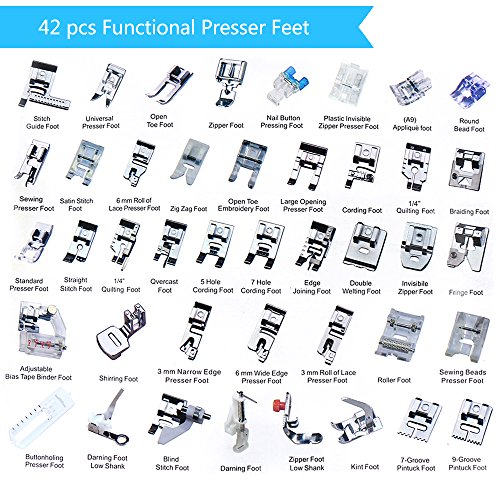 - TOTAL 42PCS PRESSER FEET SET: This is multi-functional presser feet kit which contains 42 different feet for almost all your sewing needles It includes all the popular feet like normal or invisible zippers feet, cording foot, overcast foot , satin/ straight stitch foot, shirring foot, edge joining foot and other special feet( check the image or description).