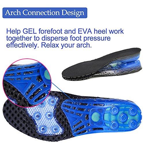 ARCH SUPPORT: The connection design under arch helps GEL forefoot and EVA heel work together to disperse foot pressure effectively. Relax your arch, good for flat feet and plantar fasciitis.